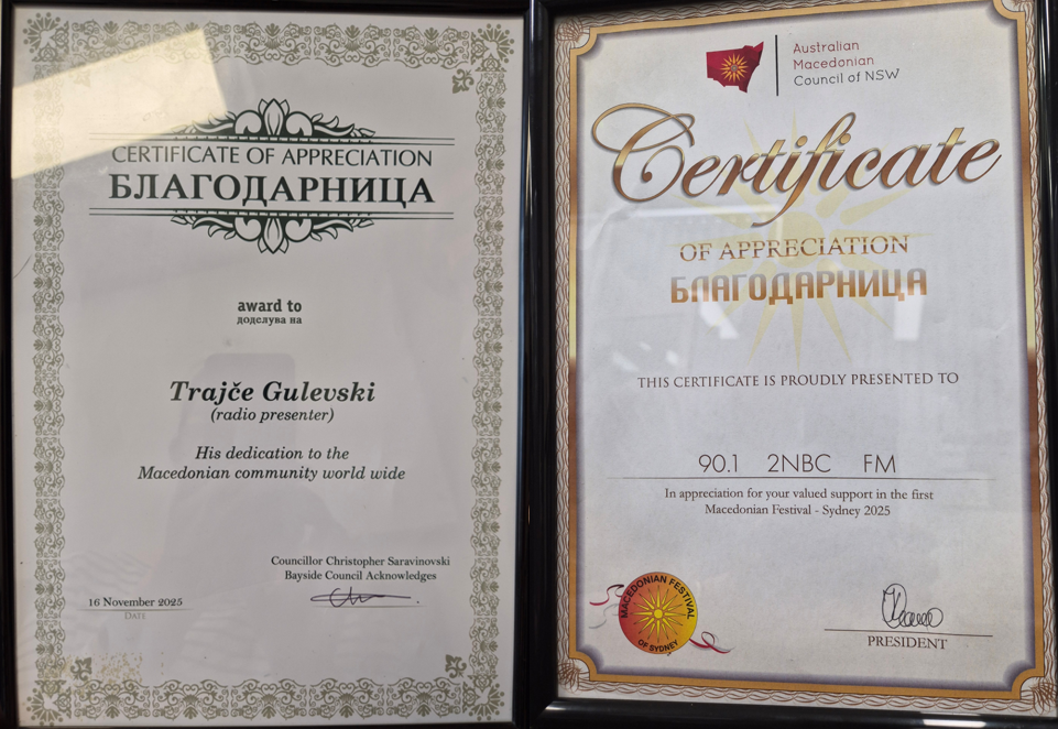 - To Trajce Gulevski, our long-time Radio Macedonia presenter (every Sunday at 11:30 am), in recognition of his dedication to the Macedonian community, and